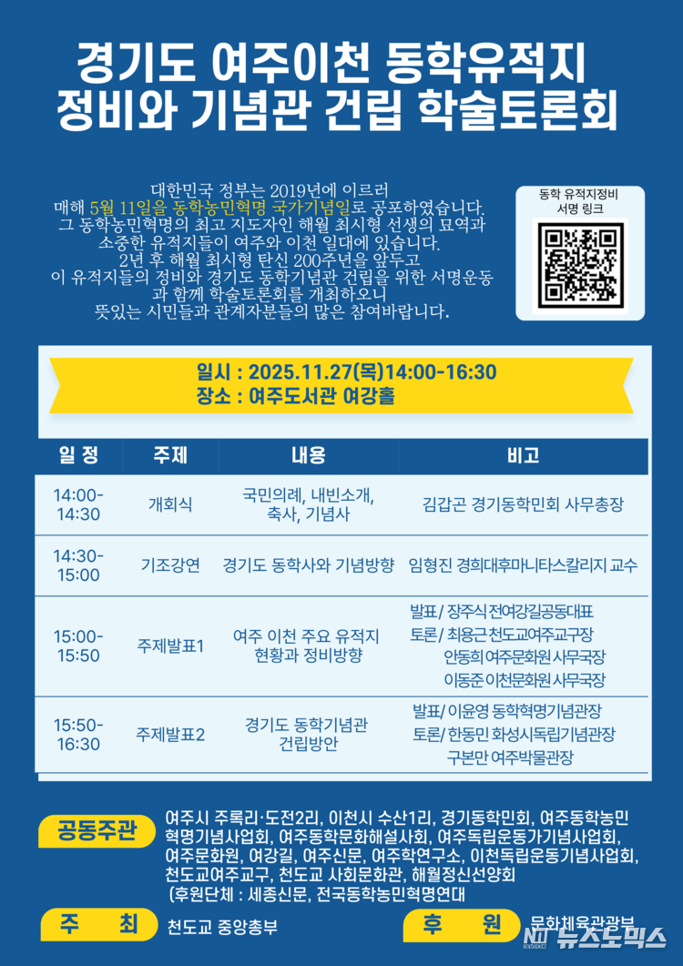경기도 여주·이천 동학유적지 정비와 기념관 건립을 위한 학술토론회가 오는 27일 오후 2시부터 경기 여주도서관 여강홀에서 열린다.