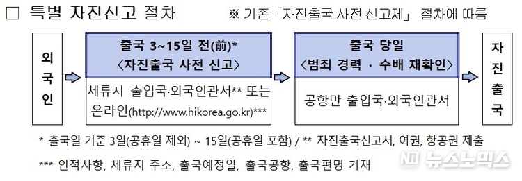 법무부는 이날 기존 자진출국 기간에는 불법체류 외국인이 범칙금을 납부한 경우에만 입국규제를 유예하였으나, 이번 특별 자진출국 기간에는 범칙금을 납부하지 않아도 입국규제를 유예한다고 밝혔다.