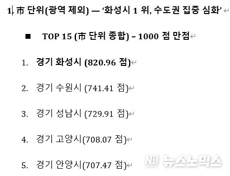 이번 조사에서 시(광역 제외) 단위 전국 1위는 경기도 화성시가 차지했다.