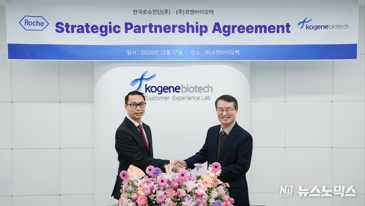 분자진단 전문기업 코젠바이오텍(대표·남용석)은 17일 한국로슈진단(대표이사 킷탕)과 인체 및 동물 질병 진단 분야의 협력 강화를 위한 업무협약(MOU)을 체결했다고 18일 밝혔다.