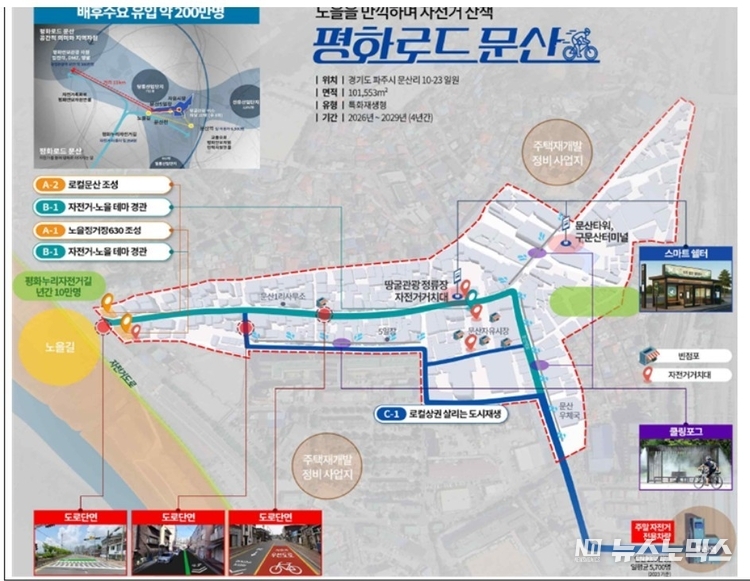 파주시 문산읍은 노후 상권과 노후주택이 혼재돼 지역 특성화가 필요한 지역이다. 문산역과 노을길, 평화누리길로 이어지는 자전거 네트워크를 활용해 자전거 특화 지역특화재생사업을 추진한다. 문산천의 노을 경관과 자전거, 쉼터를 결합한 복합문화공간을 조성하고 자전거 이용자 중심의 도로환경 개선을 통해 지역 활력 제고를 도모한다.