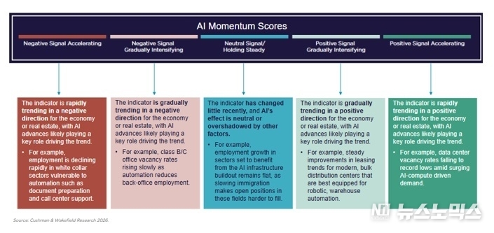 케빈 소프(Kevin Thorpe) 쿠시먼앤드웨이크필드 글로벌 수석 이코노미스트는 “AI는 더 이상 미래 개념이 아니고, 경제의 구조적 동력으로 자리 잡고 있다”며 “우리의 AI 영향력 지표는 복잡한 정보를 간추려 고객에게 AI가 성장을 주도하는 분야, 압박을 가하는 분야, 그리고 이러한 동력이 건축 환경에 어떻게 반영되는지 명확하고 데이터 기반의 시각을 제공한다”고 말했다.