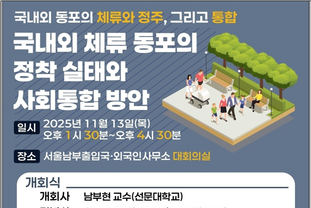 뉴스노믹스 전상천 기자 | 법무부(장관·정성호)는 지난 13일 오후 1시30분께 울남부·출입국외국인사무소 대강당에서 선문대학교, 한국연구재단과 함께 ‘국내외 동포의 체류와 정주, 그리고 통합’을 주제로 세미나를 개최했다. 이번 세미나는 국내 거주동포의 증가와 해외 거주동포 700만 시대를 맞이하여 국내와 외국에 체류하는 동포들의 출입국, 거주 등 이주 현황을 확인하고, 사회통합을 위한 정책 대안을 모색하기 위해 마련됐다. 이날 세미나는 최문정 법무부 이민통합과장이 기념사를 하고 남부현 선문대학교 교수가 좌장을 맡아 진행됐다. 이날 세미나에선 손지혜 선문대 박사가 ‘국내 체류 동포 사회통합의 이슈와 과제’란 주제로 발표하고, 안성시 외국인지원센터 최신출 사무관이 토론을 했다. 이어,곽태환 선문대 박사가 ‘한인회장이 바라본 동포의 모빌리티’; "난 살만해요. 다른 분들이 문제죠"라는 주제로 발표하고, 이용근 더 큰 아시아 이사장이 의견을 개진했다. 곽태환 박사가 사회를 본 라운드 테이블에선 ‘현장에서 느낀 국내외 동포의 체류와 정주 그리고 통합의 과정’을 주제로 열띈 토론을 했다. 이날 주제 발표에서는 국내 체류 동포가 한국 사회 구성원으로서 제도적‧문화적 통합