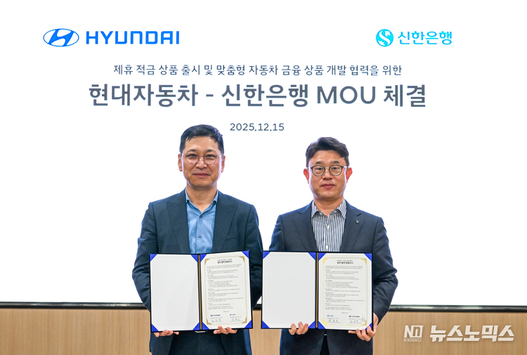 현대자동차는 지난 15일 강남대로 사옥에서 현대차 김승찬 국내사업본부장과 신한은행 장호식 CIB그룹장 등이 참석한 가운데 ‘자동차금융 상품 개발을 위한 업무협약(MOU)’을 체결했다.