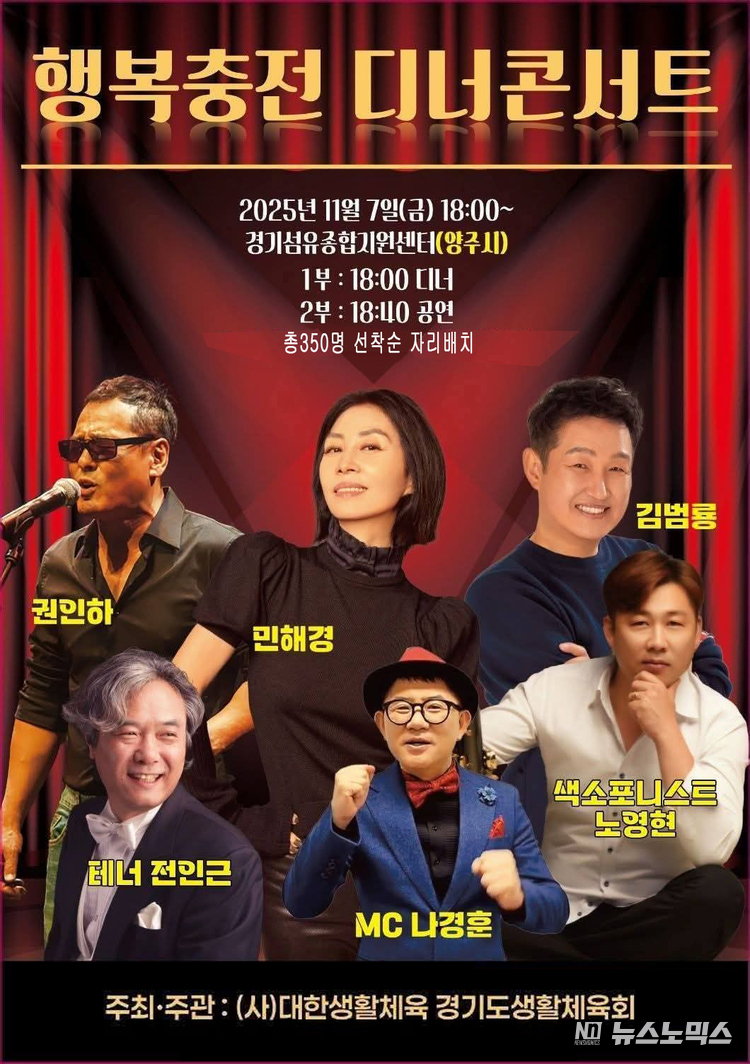 오는 11월 7일(금) 오후 6시, 양주시 경기섬유종합센터에서 ‘행복충전 디너 콘서트’가 개최된다. 이번 콘서트는 (사)대한생활체육 경기도생활체육회가 주최·주관하며, 저녁식사와 함께 즐길 수 있는 품격 있는 문화행사로 지친 일상 속 시민들에게 따뜻한 감동과 힐링을 선사할 예정이다.