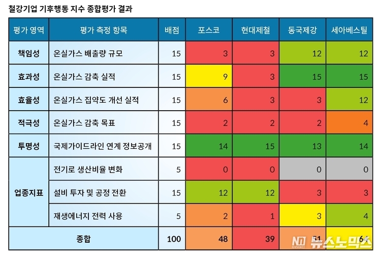 철강업종 특성을 고려한 지표를 통해서 평가한 결과, 세아베스틸이 100점 만점 중 64점으로 가장 높아 ‘보통’의 기후행동지수를 나타냈다.