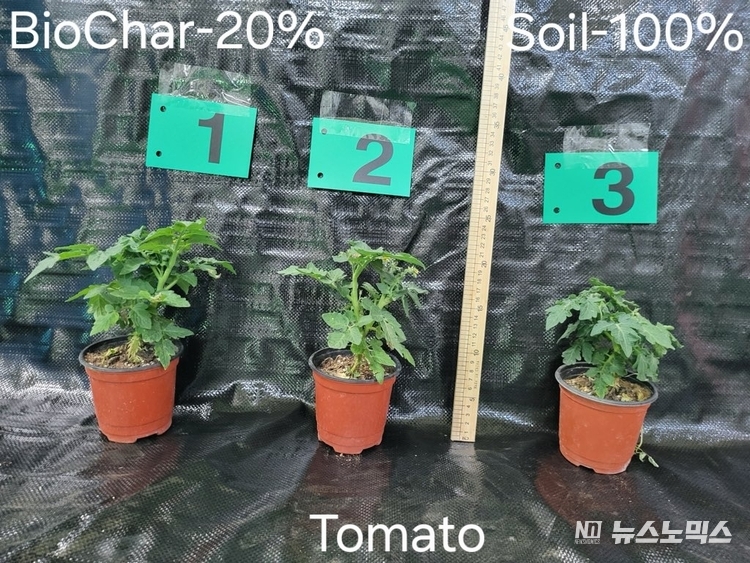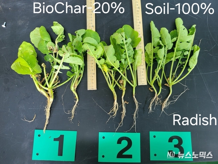 그 결과, 시험작물의 초장, 엽장, 엽폭 생체중, 엽수, 뿌리길이 등에서 바이오차 무(無)처리구에 비해 바이오차 처리구의 우수한 효과를 확인했다.