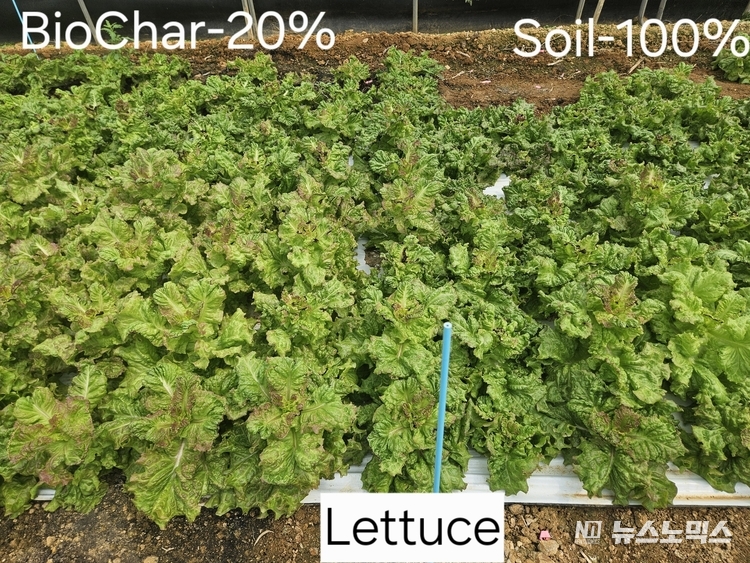 상추 재배시험에서 바이오차 20%·40% 혼합구의 39일차 생체중은 무처리구 대비 각각 약 27.4%, 49.6%로 증가했고, 타 작물에서도 우수한 효과가 발현됐으며, 비해(독성) 증상은 전 구간 ‘없음’으로 나타났다.