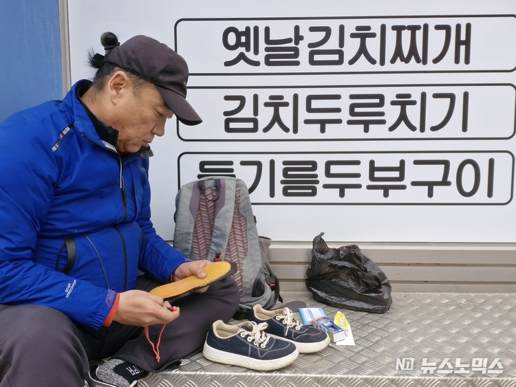 주인 아주머님의 기능성 아치 맞춤 깔창 제작을 위해, 식당 안에서는 손님들로 인하여 식당 앞에서 깔창을 만들기 시작했다.