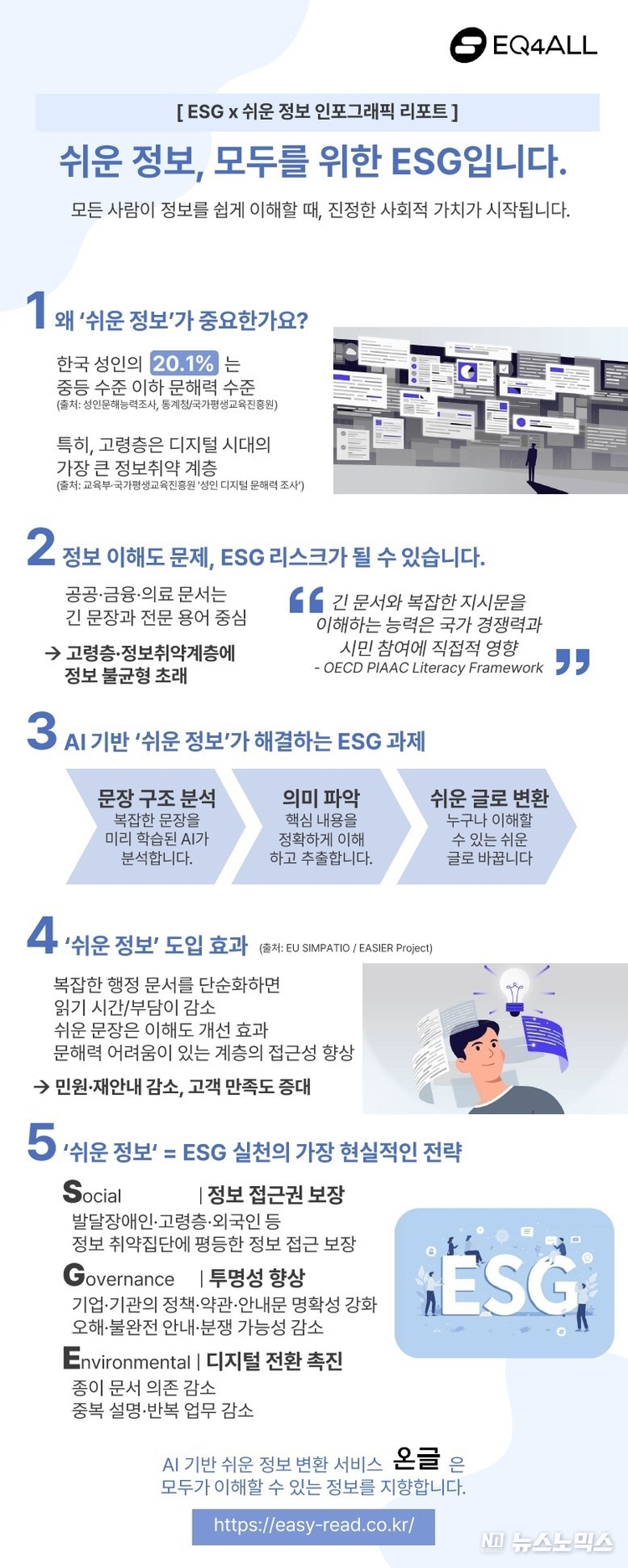 소셜벤처 이큐포올(대표 이인구)이 AI 기반 쉬운 정보 변환 서비스 ‘온글’을 활용한 ‘ESG × 쉬운 정보 인포그래픽 리포트’를 공개했다.