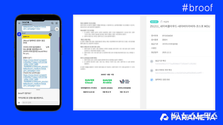 파라메타는 앞서 국가AI전략위원회 위원 180여 명의 위촉장을 브루프로 발급하며 정부 차원의 신뢰 인프라를 구축한 바 있다.