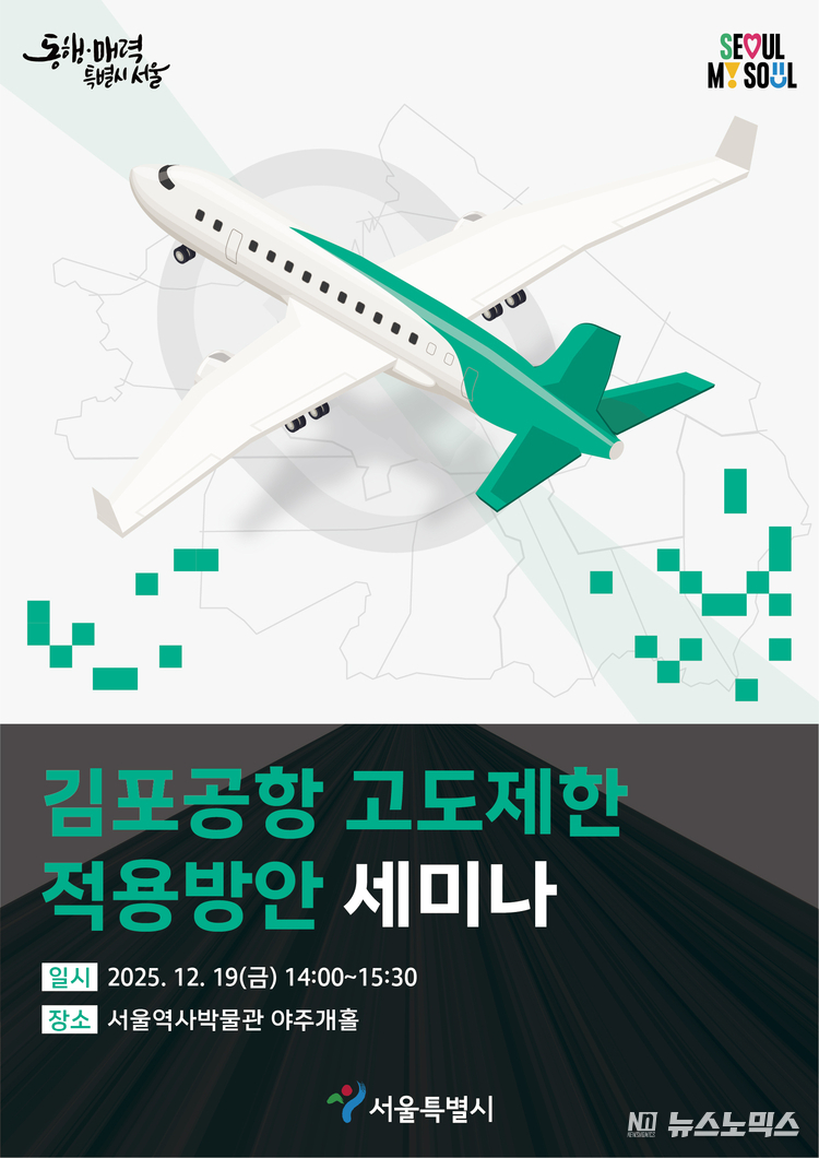 서울시는 고도제한 국제기준 개정에 따른 김포공항 주변 고도관리 방향과 국내 적용 방안을 모색하기 위해 오는 19일 오후 2시 서울역사박물관(야주개홀)에서 ‘김포공항 고도제한 적용방안’ 세미나를 개최한다고 17일 밝혔다.