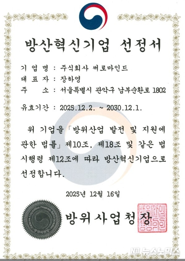 인공지능(AI) 및 빅데이터 소프트웨어 전문기업 써로마인드(대표·장하영)가 방위사업청이 주관하는 ‘방산혁신기업 100’ 프로젝트(4기)에 최종 선정됐다.