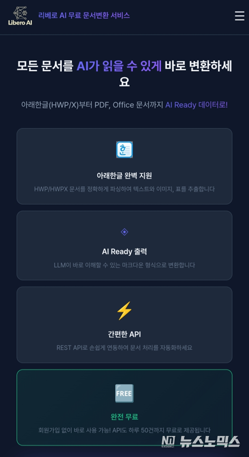 인공지능 전문기업 리베로AI(대표·강명덕)는 국내 최초로 온프레미스 기반 아래한글(HWP, HWPX) 문서를 AI 친화적 포맷인 마크다운(Markdown)으로 변환하는 서비스를 출시했다고 24일 밝혔다.