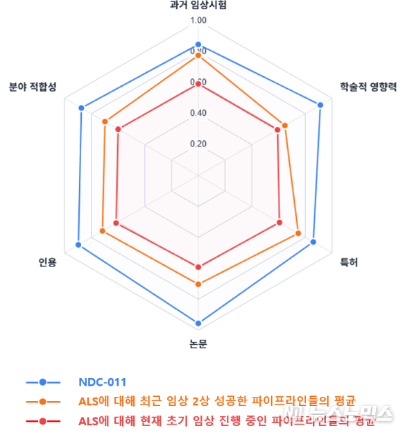 NDC-011은 학술 영향력, 논문 발표 및 인용 지표에서 최근 ALS 임상 2상 성공 그룹 평균을 상회하는 수치를 보였다.