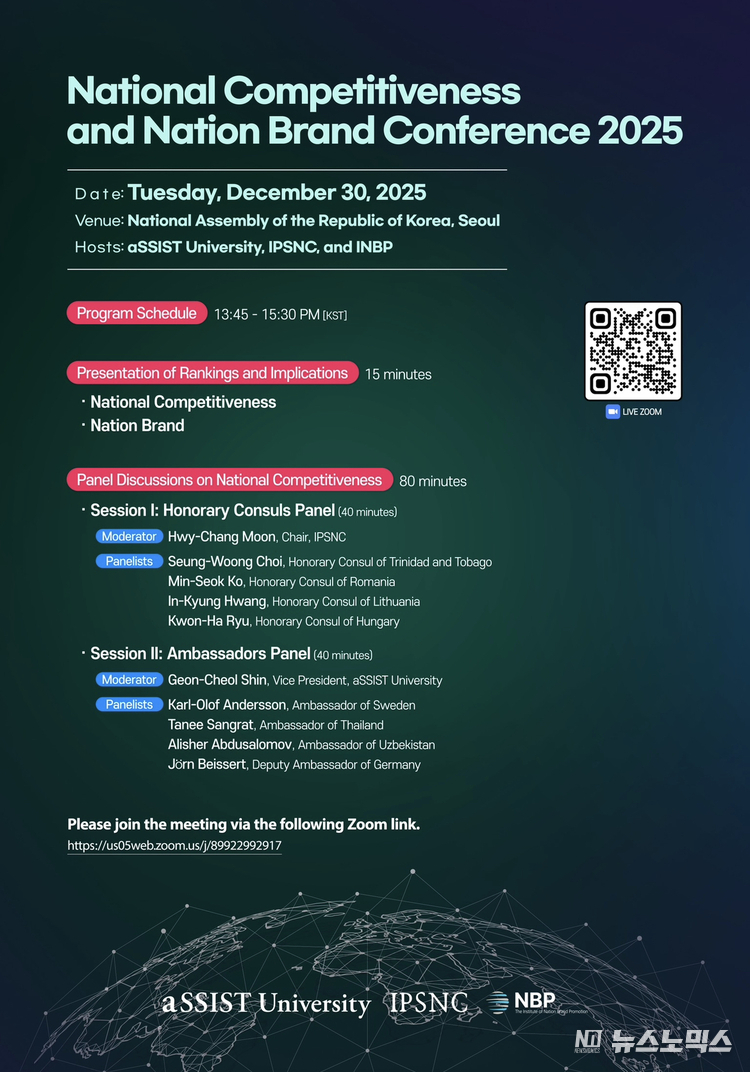 The Institute for Policy and Strategy on National Competitiveness (IPSNC) and the Institute of Nation Brand Promotion (NBP) will co-host the “2025 National Competitiveness & Nation Brand Conference” on Tuesday, December 30, at the National Assembly Library Auditorium in Seoul.