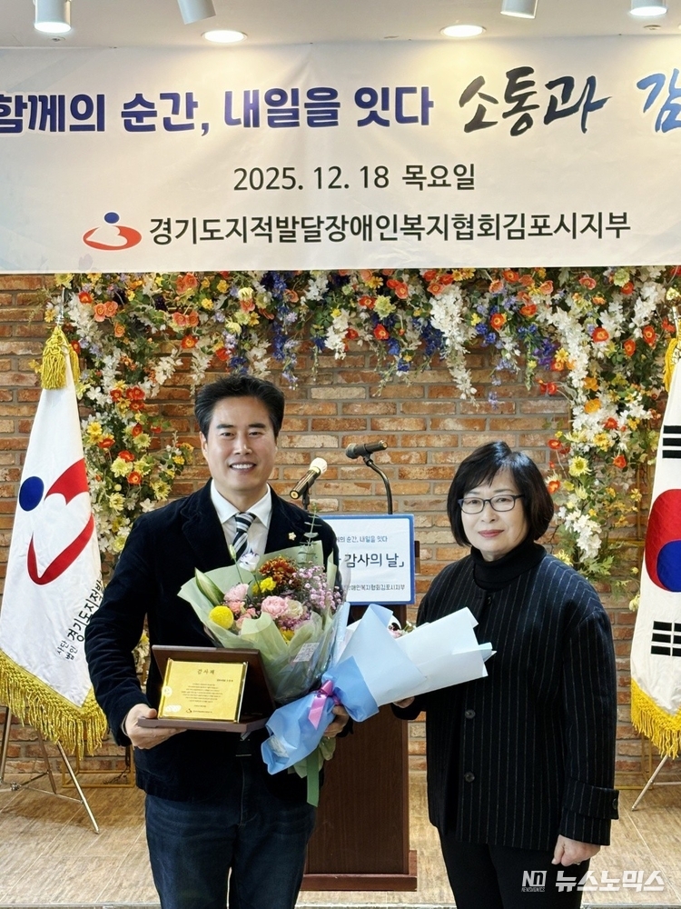 경기도지적발달장애인복지협회 김포시지부는 지난해 12월18일 ‘2025년 함께의 순간, 내일을 잇다 소통과 감사의 날’ 연말 행사에서 오강현 김포시의회 의원에게 감사패를 수여했다.