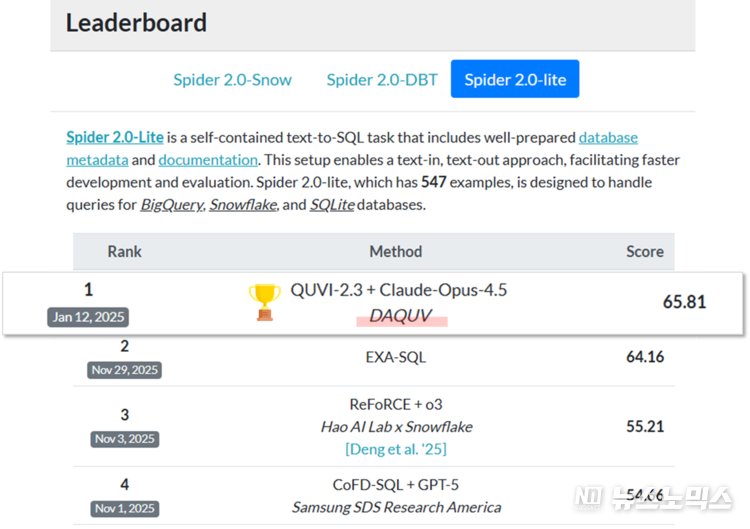 다큐브(대표·윤예지)가 국제 Text-to-SQL 성능 평가 지표인 ‘Spider 2.0’의 Lite 부문에서 세계 1위를 기록했다고 20일 밝혔다.