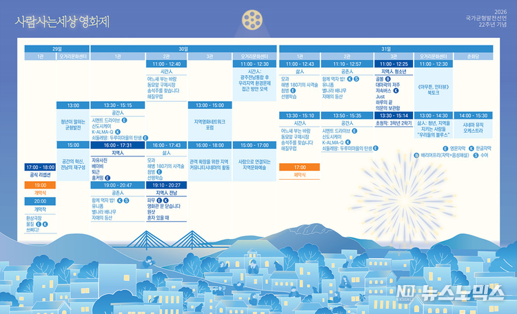 기념행사의 주요 프로그램으로 ‘사람사는세상 영화제’가 함께 열린다. 이번 영화제는 국가균형발전선언 22주년을 맞아 사람이 중심이 되는 사회와 지역의 삶을 영화로 다시 묻고자 마련됐다.