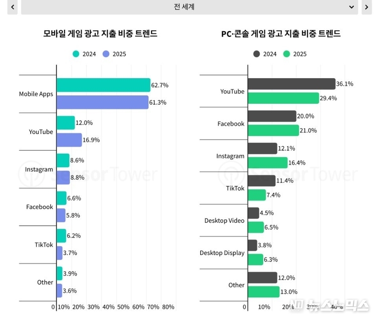 모바일 게임 광고에서는 YouTube 비중이 전년 대비 증가했다. 이는 다운로드 규모 확대보다 수익화와 유지율, 고가치 사용자 확보를 더욱 중요하게 보는 시장 흐름과 맞물린 변화다. 반면 PC·콘솔 게임에서는 YouTube 비중이 감소했지만 여전히 광고 지출 기준 가장 큰 채널을 유지하고 있다.