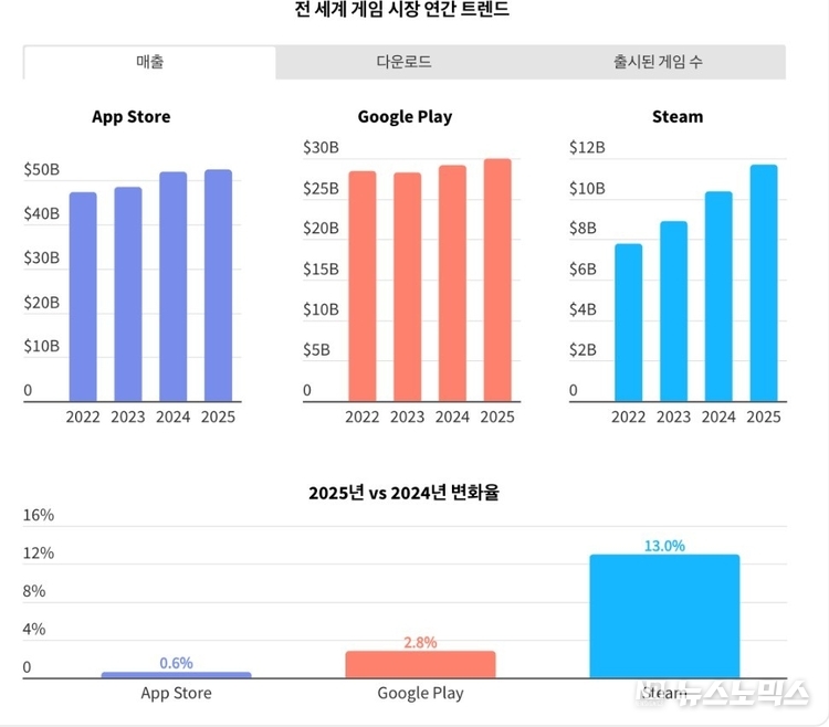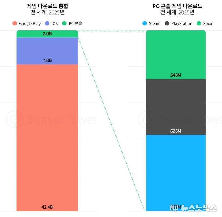 리포트에 따르면 2025년 전 세계 모바일 및 PC·콘솔 플랫폼에서 발생한 게임 다운로드는 총 520억 건으로 집계됐다. 이 가운데 약 500억 건이 모바일에서 발생하며 게임 시장에서 모바일의 압도적인 규모를 보여줬다.