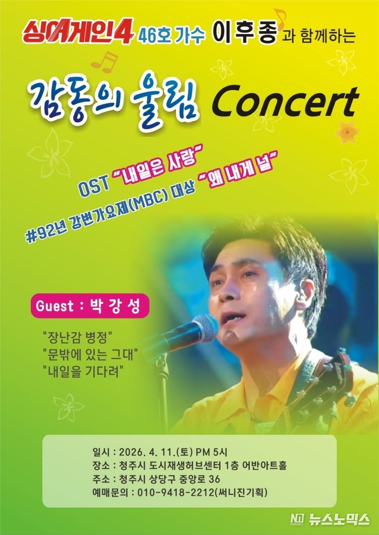 이번 청주 단독 콘서트는 데뷔 30여 년 음악 인생을 돌아보는 자리로 마련된다. 강변가요제 대상곡 ‘왜 내게 널’을 비롯해 대표 OST 무대가 펼쳐질 예정이다.
