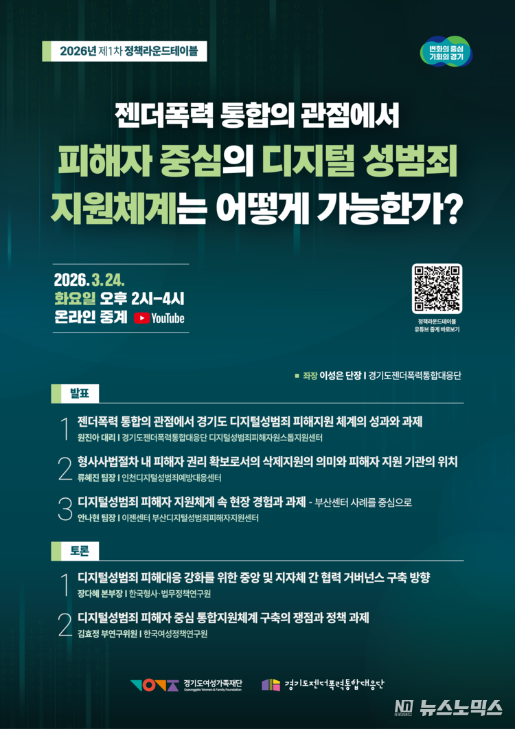 경기도와 경기도젠더폭력통합대응단은 24일 오후 2시 ‘젠더폭력 통합의 관점에서 피해자 중심의 디지털 성범죄 지원체계는 어떻게 가능한가?’라는 주제로 2026년 제1차 정책라운드테이블을 개최한다.