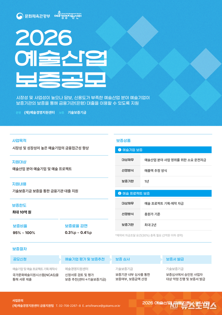 예술경영지원센터(대표·김장호는 기술보증기금(이사장·김종호)와 협력해 예술기업의 금융 접근성 향상과 지속 가능한 성장을 위한 ‘2026 예술산업보증’ 공모를 1일부터 시작한다고 밝혔다.