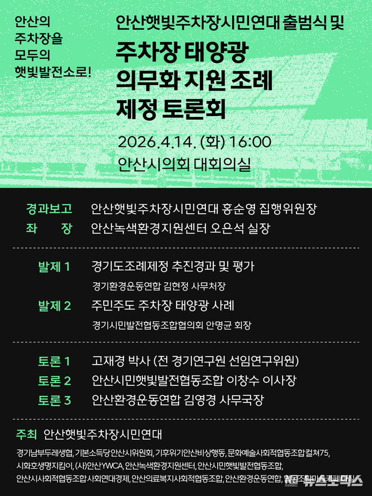 홍순영 집행위원장은 “안산햇빛주차장시민연대의 출범은 공영주차장을 시민이 함께 만드는 에너지전환의 공간으로 바꾸기 위한 선언”이라며 “시민참여와 공공성, 발전이익의 시민 환원을 담은 안산형 조례 제정을 끝까지 추진하겠다”고 밝혔다.